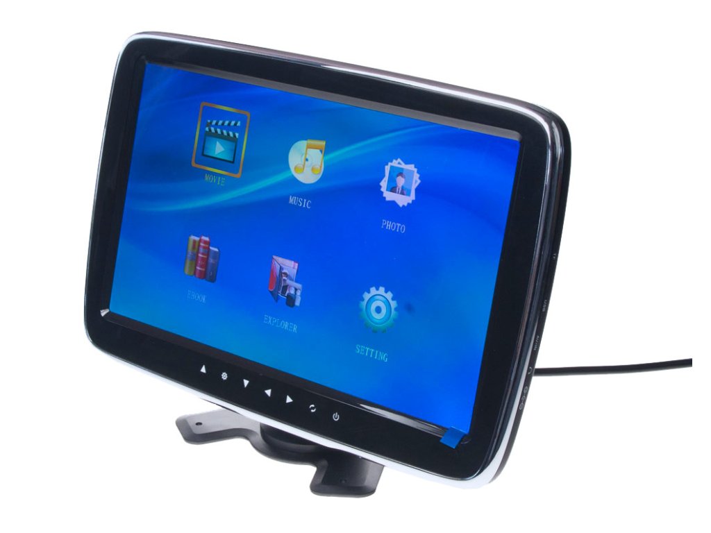 Kvalitný 10" LCD monitor s dotykovými tlačidlami, určený na montáž na palubnú dosku, s čítačkou microSD kariet, USB portom (možnosť prehrávania súborov: video, hudobné, fotografie, elektronická kniha), so zobrazením 16:9 a FM modulátorom.